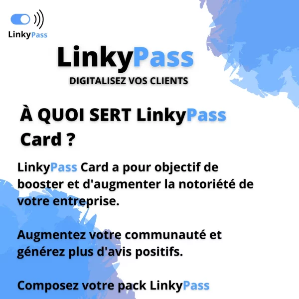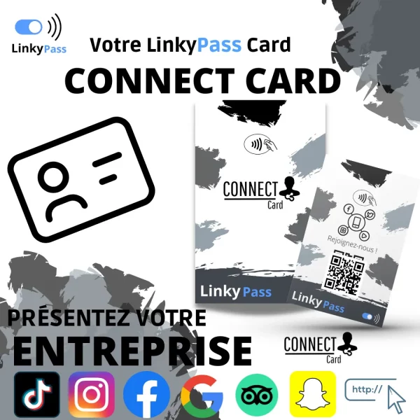 Notre carte sans contact utilisant la connexion NFC avec QR code est disponible en plusieurs modèles, tels que Google, TripAdvisor et Connect Card. Conçue pour faciliter la réception d’avis et le partage de vos coordonnées, cette carte permet à vos clients de vous laisser un avis en un simple geste, optimisant ainsi votre réputation en ligne et boostant votre visibilité.